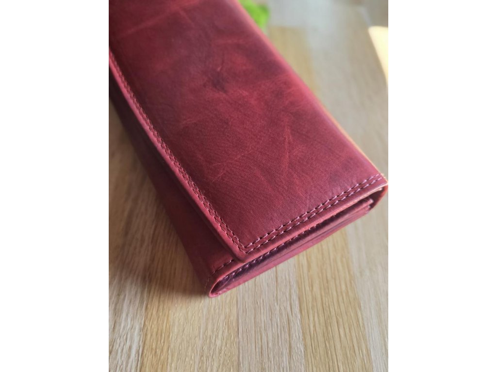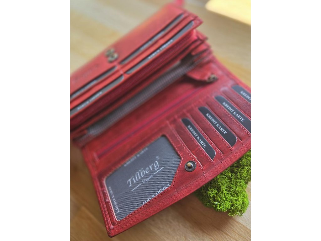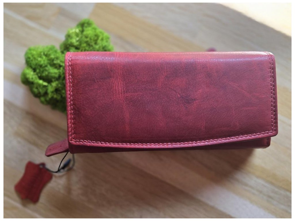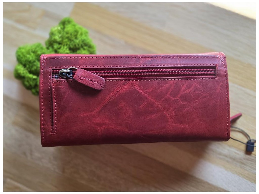 Dámská kožená peněženka rozdělená na několik přihrádek, přihrádka na mince, bankovky, kapsičky na karty jedna vnější kapsa na zip.
