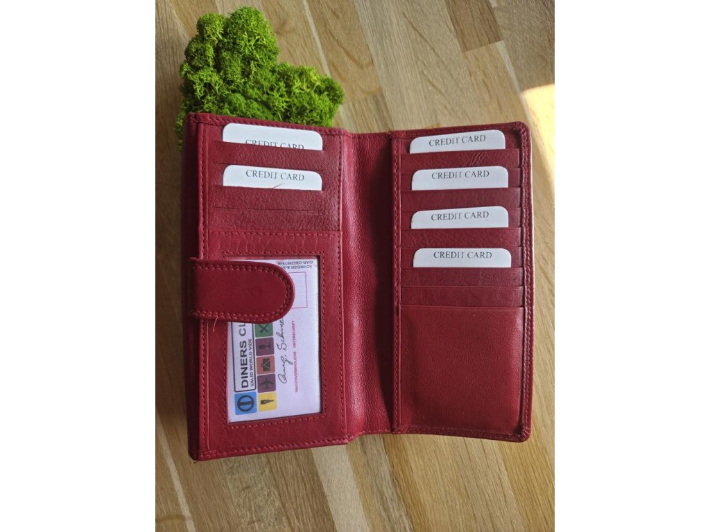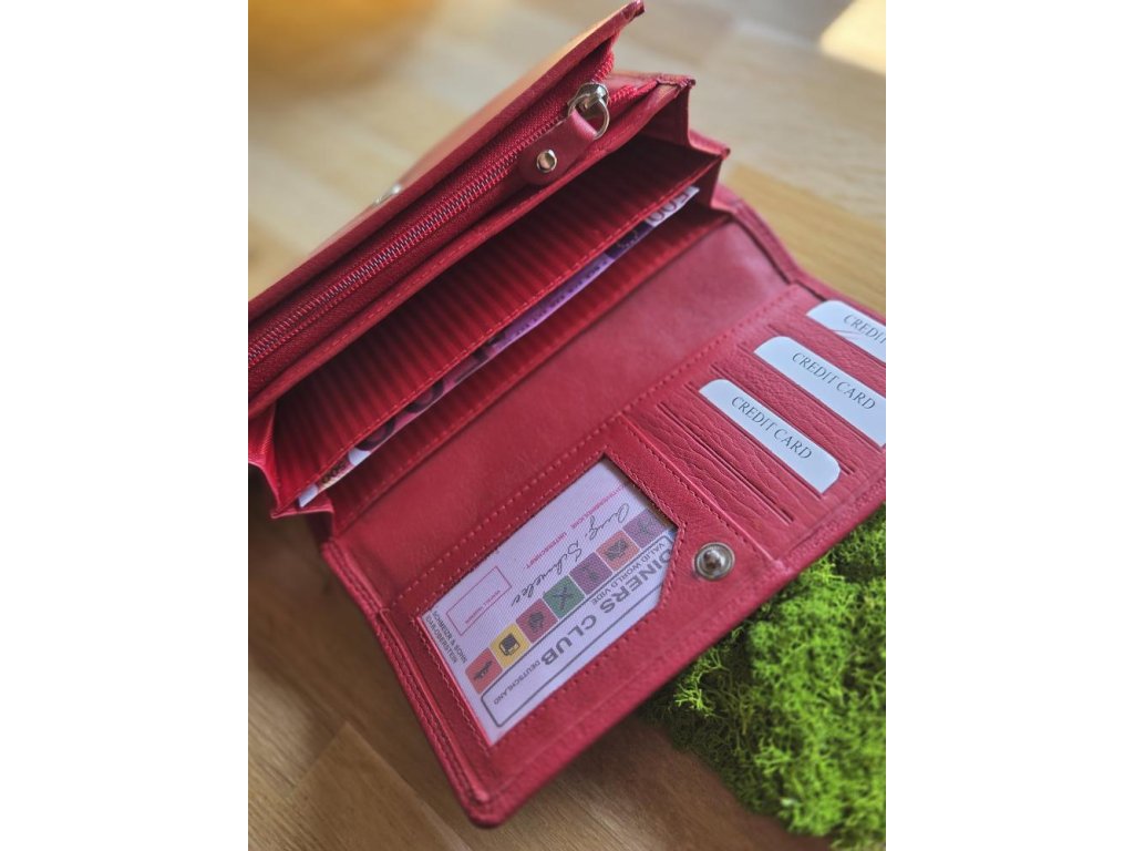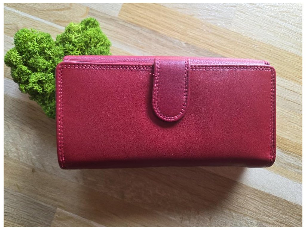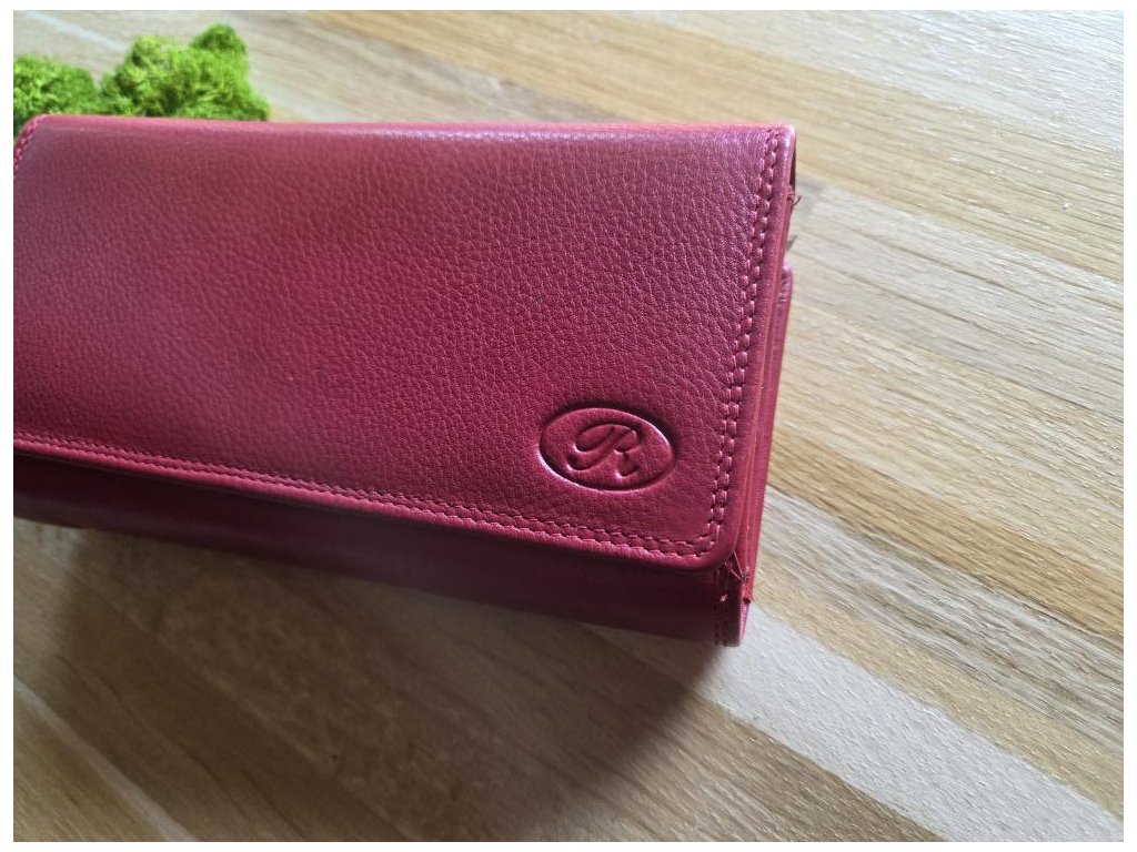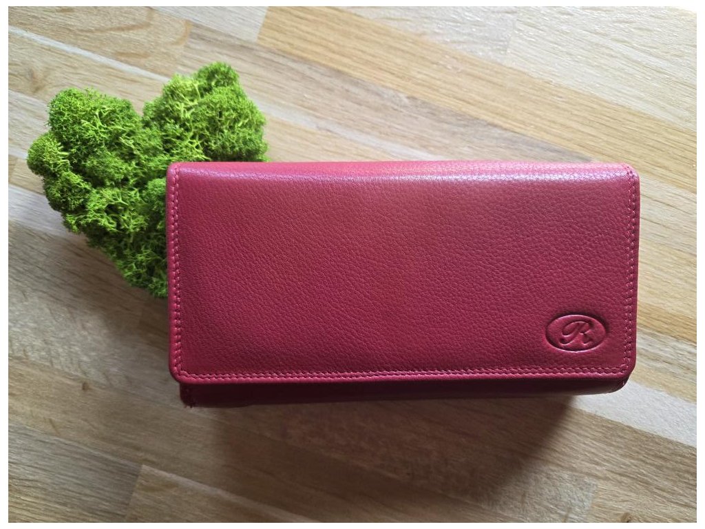 Dámská kožená peněženka rozdělená na několik přihrádek, přihrádka na mince, bankovky, kapsičky na karty jedna vnější kapsa na zip.