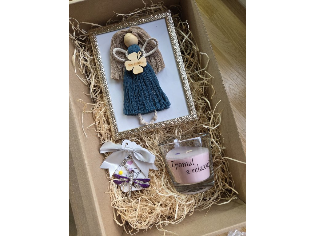 Dárková krabička s macrame andělkou, přívěskem a svíčkou ''Zpomal a relaxuj''