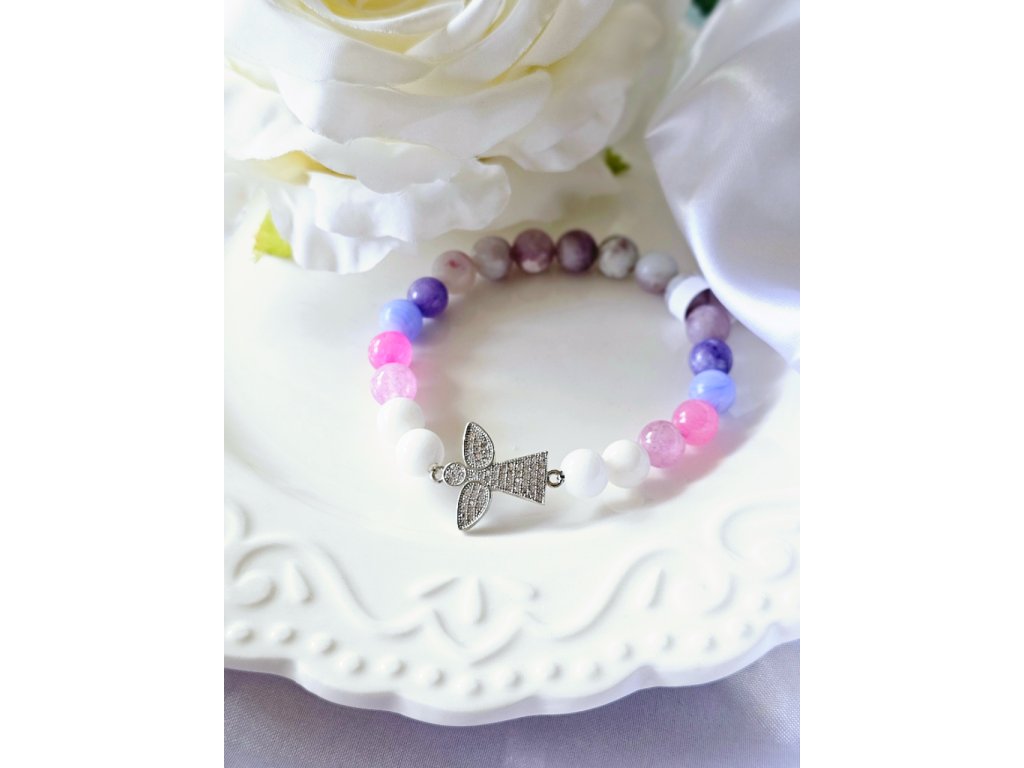 Ručně vyrobený náramek s andílkem, který má na sobě krásné kubické zirkony. Náramek je z Jadeitu a Kunzitu.