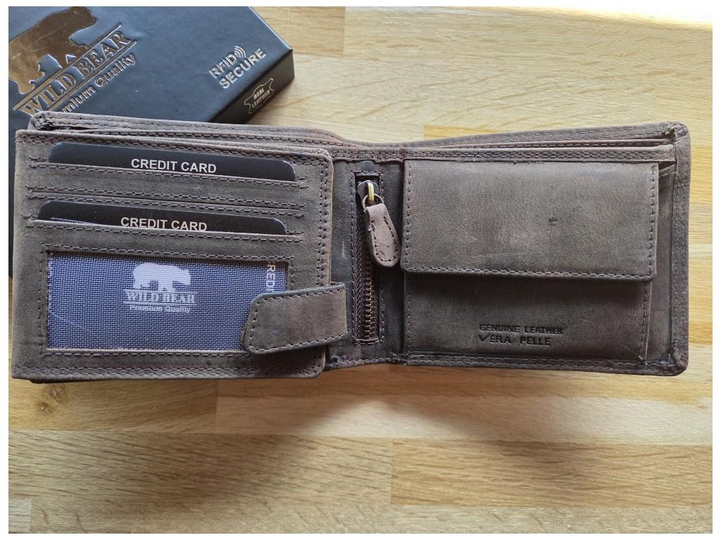 Luxusní pánská kožená peněženka v největší kvalitě! Dodávána v dárkové krabičce. Kapsičky na mince a bankovky, několik přihrádek na karty a kapsa uzavíratelná na zip.