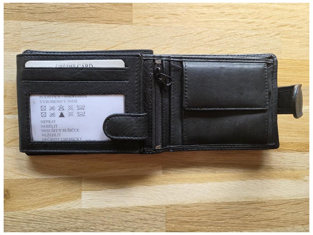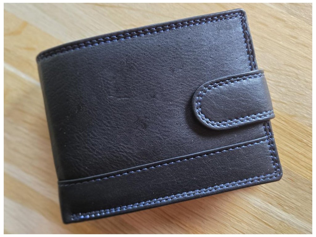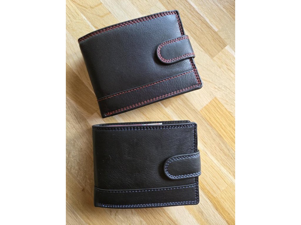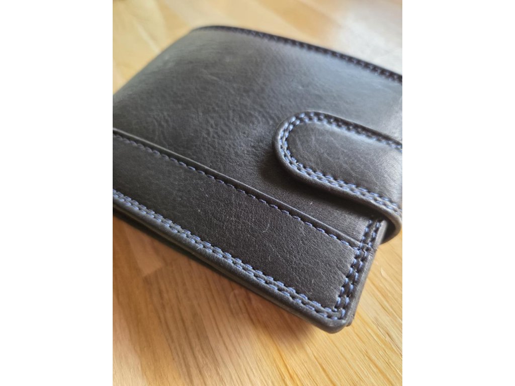 Pánská kožená peněženka v černé barvě s modrým prošitím a s nastavitelným zapínáním. Kapsy na mince a bankovky a hned několik přihrádek na karty. Vnitřní kapsa uzavíratelná na zip.
