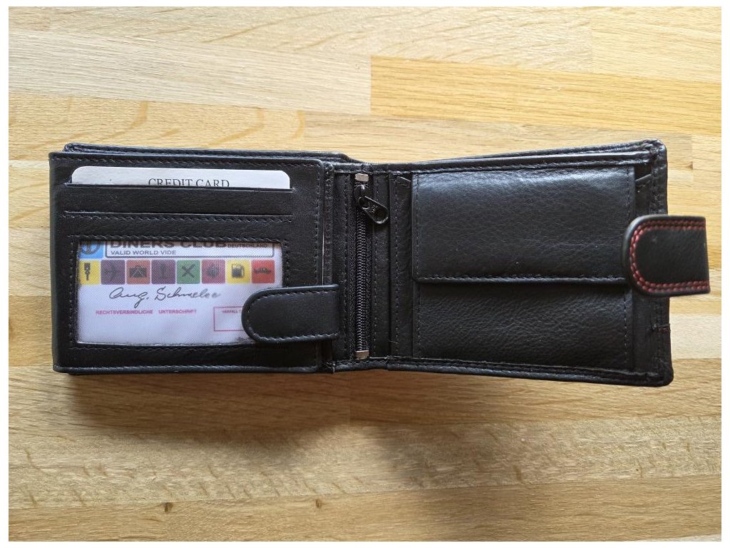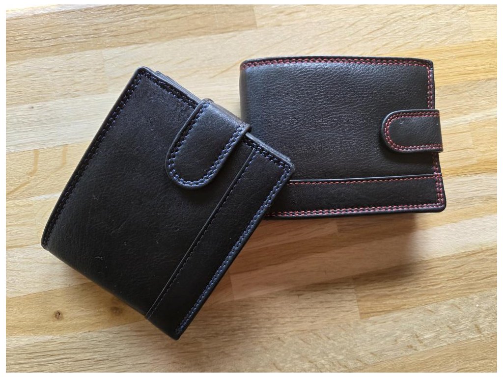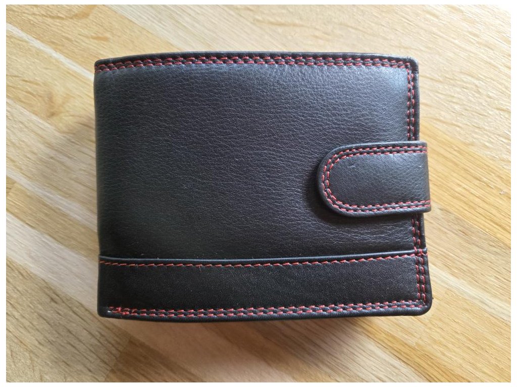 Pánská kožená peněženka v černé barvě s modrým prošitím a s nastavitelným zapínáním. Kapsy na mince a bankovky a hned několik přihrádek na karty. Vnitřní kapsa uzavíratelná na zip.