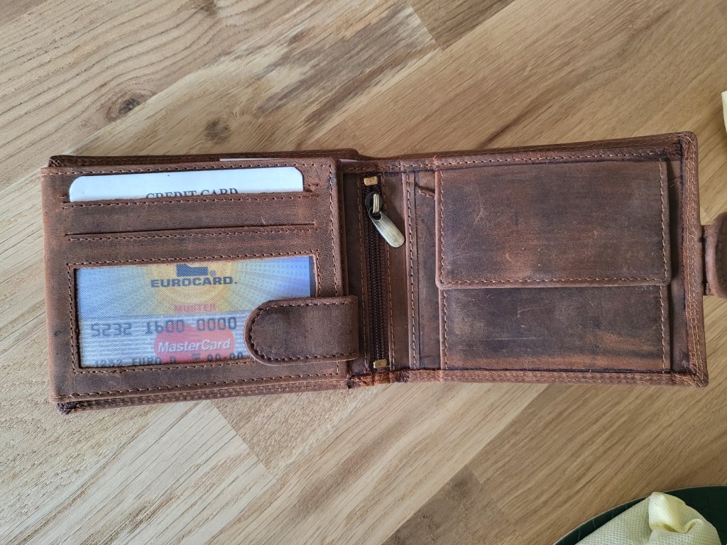 Pánská kožená peněženka z broušené kůže. Peněženka má zapínání dle potřeby, vnitřní kapsu na mince a dvě prostorné přihrádky na bankovky. Dále kapsy na doklady a přihrádky na karty.