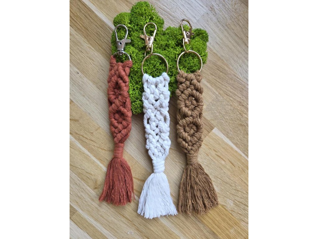 Ručně dělaný přívěsek macrame v hnědé barvě se zlatou sponou.