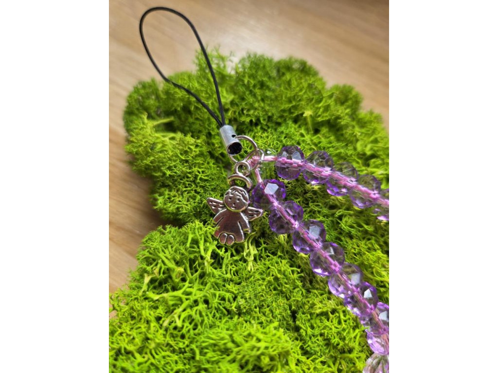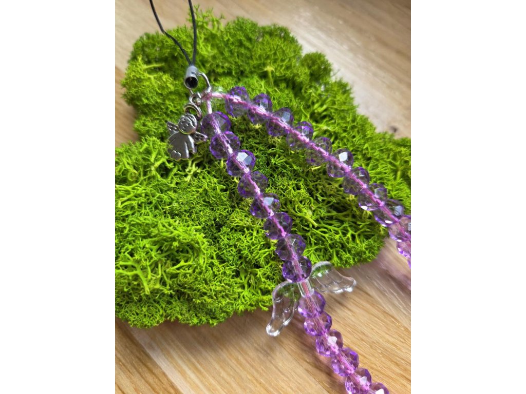 Ručně vyrobený korálkový přívěsek ze skleněných broušených korálků na mobil s andělskými křídly a andílkem pro ochranu. Přívěsek vypadá jako náramek.